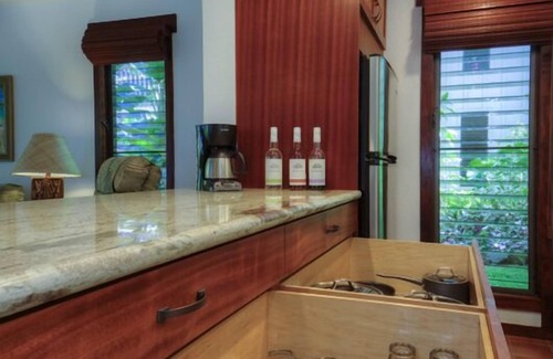 The spacious kitchen area features two island cabinets and pantry that is all hand crafted on Kauai and is made out of beautiful red ribbon-grained sapele mahogany. There is a matching large bathroom vanity with a granite counter.