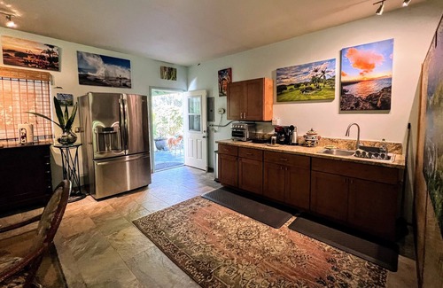 Accommodations include an oversized bedroom, a king bed, and a lovely private bathroom. We converted our double garage into a spacious, equipped kitchenette and living and dining area. Here you will find a library of various books and games. The spacious, 500 sq feet furnished area offers a beautiful garden view when the doors are open. The laundry room for the property is in this area. There is also a delightful courtyard and BBQ area where you can dine outside.