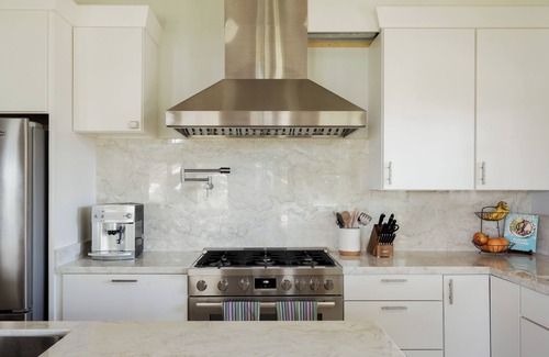An adjoining door off the living room leads you into the Bamboo Suite, which includes a king bed, desk area and remodeled kitchenette. Step onto The Bamboo Suite’s peaceful back porch and enjoy breakfast on the cafe table, time on your yoga mat, or just snooze on the chaise loungers. Not only does the Bamboo Suite include a large, full bathroom with a Toto toilet and double shower heads, but guests can also soak under the brand-new outdoor rain shower or in the custom basalt tub.