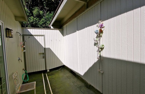 A large private, free standing cottage/home with full amenities located 2 miles above Waimea Bay, including, in addition to the full bathroom, an added outdoor shower area, beautiful acre of green lawn and a TV room with 50' Plasma TV/DVD and quiet split Air Conditioning.