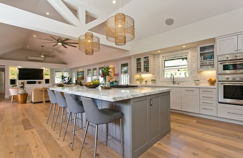 Ask owner about available dates/rates. Elegantly remodeled in 2018, this one level, very clean, 4 bedroom & 3 bath home, has 2 master suites, a gourmet kitchen, air conditioning in every bedroom & high end finishes throughout this private oasis. Please inquire about your specific dates and we can try to accommodate your stay. The saltwater pool – tiled and heated, is bordered by a large lanai with chaise lounges and tropical landscaping. There is a private entrance to the separate, one bedroom studio that can serve as a 2nd master bedroom with bathroom. Located on a quiet street with a short walk to Kahala Beach, yet close to many great restaurants, shopping and hiking trails. Some features include a 30” Subzero fridge, 100 bottle wine fridge, Thermador built in coffee maker, Thermador 6 burner gas stove, 2 Bosch dishwashers, steam oven, outdoor gas BBQ, marble island that seats 6, walk in pantry and large laundry room. There are 3 private office workspaces with excellent Wi-Fi service if you plan on working. Stocked with many conveniences such as beach towels, beach chairs, beach umbrellas and coolers, all included for your use at this tropical retreat. Ask owner about available dates/rates.