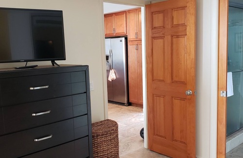 The tropical themed bedroom has a King size bed with lots of pillows and a Smart TV. From the bedroom slider, look up at the dark night sky, the numerous constellations and then wake to mountain and ocean views.