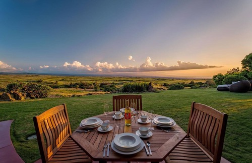 This architectural gem was constructed on a 3-acre gated property between the Kohala Coast and the town of Waimea. This spectacular residence is perched over the Waiaka stream with ocean views and a perfect panoramic view of three of the Big Island's awe-inspiring volcanoes (Mauna Kea, Mauna Loa and Hualalai). Throughout the landscaped property guests will find secluded seating areas, a hammock and a small soccer field. Unique to this FLW home, guests are only a short 10 minute drive to beautiful white sand beaches, world class resorts and plentiful golf courses on the Kohala Coast. Also within a short drive is the country town of Waimea where bountiful farmers markets will supply you with all the fresh locally-grown ingredients you will need to make memorable meals during your stay.