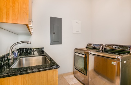 The Master Suite encompasses the entire upper floor and includes a king bed, a sitting area and a large bathroom with custom stone tub, his and her sinks and a make up sitting area. A full width private balcony is accessed via large sliding glass doors, which opens the entire room to infinity views of the ocean. There is also a large walk-in closet and a small office area.