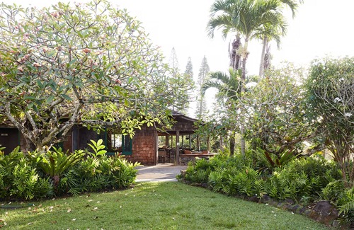 The lodge was built in the distinctive style of noted architect C.W. Dickey in 1935 and is an example of the golden age of Hawaiian architecture. It features a majestic room (about 1,350 sq ft) furnished with Balinese and Hawaiian wood and textiles, rough-cut wood beams, a lava-rock fireplace, a library, and sitting areas. Attached to the lodge are a certified commercial kitchen and a shaded lanai (about 800 sq ft). In front of the main building, a large yoga deck overlooks a lawn that sweeps down, offering ocean views. A pool nestles behind the building. The surrounding landscape was redesigned by Leland Miyano in 2013 using native plants. Lodge guests have exclusive access to the 12-bedroom home and outdoor pool.