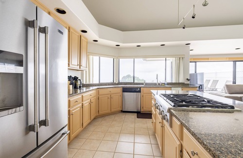 All rooms in the Koya Suite overlook the Pacific Ocean through the lanai, deck and infinity pool. The master bedroom has two queen beds– when you awake you can see 30 miles of the Kona coastline and ocean from your bed - often along with 55 mile visibility to the horizon. It has an attached private master bath with a large soaking tub as well as a walk-in shower. The second bedroom features one queen bed and one twin-sized bed. It has its own bath down the hall. That bathroom also is where the laundry room it located that features (2)modern full size washer/dryers. There is also a large sofa in the living room. The enormous gourmet Kitchen/Living Room/Dining Room has every amenity a chef could want. The Koya Suite is about 1,800 sq ft and the deck and pool easily adds another 1,000.