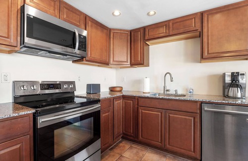 Inside this lovely unit, you'll find a full-sized washer and dryer, complimentary WiFi, central air conditioning throughout and a comfortable living room with seating for six. You'll love the upgraded kitchen, which has new appliances, plus an island with seating for two. The first bedroom includes a king-sized bed and the second bedroom has a queen-sized bed. Both are perfect for accommodating many guests comfortably. Each room comes with its own bathroom for privacy and comfort. You'll love lounging on the cozy futon sofa while taking in the gorgeous ocean views. Enjoy crystal clear views from the furnished lanai, which features seating for four. Two additional lounge chairs provide even more comfort.