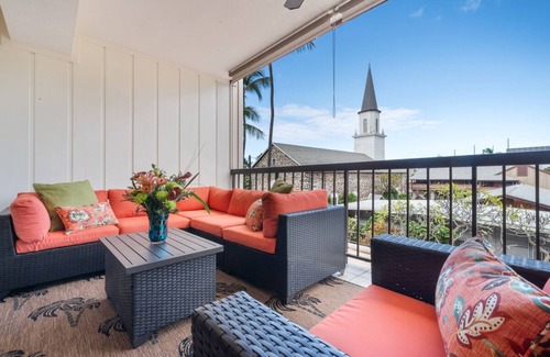 The spacious Lanai affords many opportunities for gazing with amazing views of the Historic, Mokuaikaua Church and gardens completed in 1837! Expansive sliding doors entice the fresh tropical air and sunlight into the living room, bringing the outside in. Relax and enjoy the peace and tranquility.