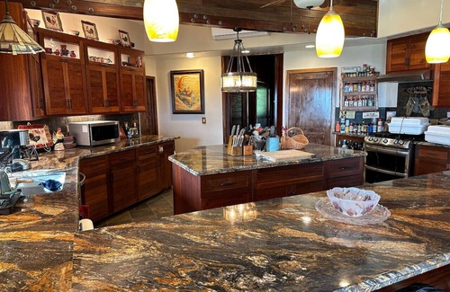 Come stay with us at our 3 story 8,000 sq ft farm stay B&B. The structure is a custom home with 100% Bali teak and also includes custom wood designs on most of the interior walls with wood sourced from the island. All three stories have panoramic ocean views on the East side of the home and garden and waterfall/creek views on the West side. The top floor features a 1200 sq ft dining lani suitable for large groups. The top two floors are exclusively for guests, where you can have your privacy and enjoy the large living spaces shared only with 2 other guest rooms on the floor.