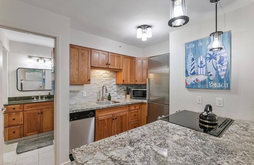 From the moment you enter the condo, you will be greeted by spectacular ocean views through the glass doors next to the living room! There is comfortable lounge seating for up to 4 guests, and the sofa folds out to a queen bed when needed. A sofa bedding kit is located in the walk-in closet, adjacent to the primary bedroom. In the corner of the living room, there is a large, smart TV with a Xumo Stream Box for streaming your own favorite channel subscriptions thanks to super fast Wi-Fi. There are blackout curtains and 3-inch shutter blinds that allow for privacy and rest after a long day of island adventures.