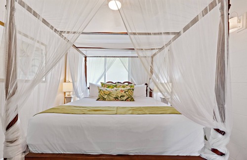 The bathroom has been thoughtfully renovated and features a convenient walk-in shower, enhancing your comfort and convenience during your stay. The bedroom boasts a touch of luxury with a king-size canopy bed, promising restful nights and a sense of opulence.