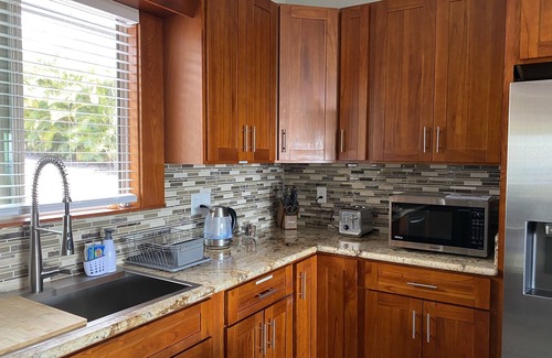 This comfy, stylish guesthouse is located near Kealakekua Bay and the Captain Cook Monument. Here you can enjoy snorkeling, hiking, kayaking, boat tours and scuba diving. Our Guesthouse offers 2 bedrooms with queen beds, a full-size kitchen, lanai, laundry room and BBQ area. Enjoy spectacular mountain and ocean views, breathtaking sunsets and tropical landscaping, flowers, and palm trees! We hope that you have a memorable, safe & relaxing stay on the Big Island of Hawaii.