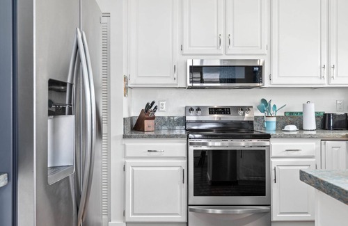 The fully equipped kitchen has granite countertops and updated appliances including a dishwasher, stove, refrigerator, microware, blender, Kuerig, 12-cup coffeemaker and Instapot. It also has a large farmhouse table, highchair, and a backyard BBQ.