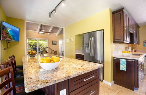 Our Poipu Garden Villa is complete with tasteful furnishings, Hawaiiana artwork, and a terrific custom kitchen with two dishwashers and two sink areas - one for prep, one for clean up.