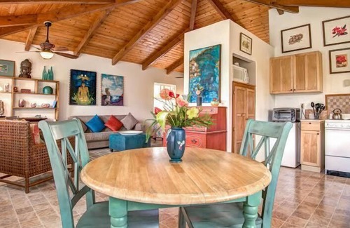 Minutes from Hawaii Volcano National Park, Bamboo View Cottage is nestled in the tree tops with views overlooking the beautiful landscrape of a 9 acre estate. . The Bamboo View Cottage is a freestanding private large upstairs (24x24) studio cottage that has a kitchenette,(complete with frig. ,apartment size stove, microwave, , 1 king bed , futon couch, dining area, bathroom with shower ,sitting area, has its own driveway, fenced yard , totally enclosed patio with bamboo fencing and sauna with front entrance faces the rain forest. You area is on a quarter acre shared by no one. ( Downstairs is a storage area you do not see.). The Studio has just been renovated to a contemporary Hawaiian style with oil paintings, fresh cut tropical flower arrangements.