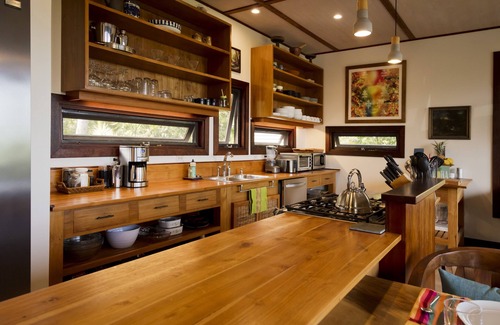 Kalapana Beach Haven feels grand, rich and earthy. The oversized front doors open onto a foyer and a dramatic wide, open stairway that runs up through the center of the home. The stairs were designed with wide treads and a low rise making the house easily accessible. The central staircase was constructed in Bali and shipped back to Hawaii in large sections. custom doors, windows and furniture made from tropical hardwoods (Merbau, Teak and Tigerwood) all imported from Bali. The Bathrooms and decks are covered in gorgeous Palimanan sandstone tiles. High ceilings throughout the home give it an expansive feeling, and showcase the magnificent views.