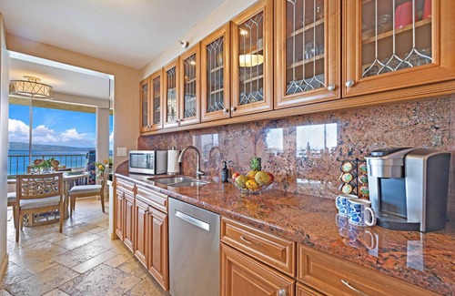 A culinary dream with granite counters, stainless steel appliances, ample cookware, and ocean panoramas inspire everything from quick acai bowls to full-course feasts.
