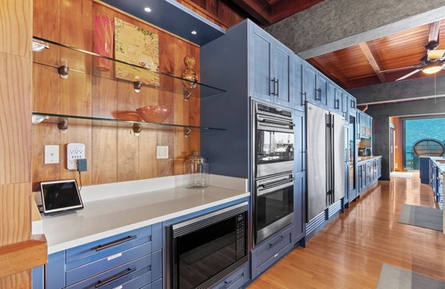 The open-concept layout of Samurai House blends Japanese-inspired aesthetics with modern elegance. The kitchen is a central highlight, equipped with state-of-the-art appliances, a wine storage system, bar seating, and oversized countertops that make meal preparation and entertaining a delight. With five large sliding glass doors, the kitchen opens to bring in refreshing ocean breezes and natural Hawaiian sunlight.