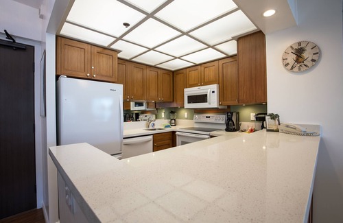 ** REMODELED Sept-Oct 2018**. Unit #759 - Tower 2. We have completely replaced our Kitchen by removing the wall to open it, all new custom cabinets, quartz countertops, new appliances and flooring. In the bath area, new vanity cabinet, quartz countertop and removed the tub to install a beautiful new walk-in shower with sliding glass doors, new flooring and carpet throughout the unit. We still have our signature Sleep Number bed, large L-Shaped sofa/queen sleeper, and entertainment system with Bluetooth, DVR & Xbox One (along with controllers and a couple games) in both the living room and bedroom. Our side of the tower is the south side/sunny side. This provides us with lots of beautiful natural sunlight throughout the day, plenty of space between our tower and the Westin hotel for privacy so you can keep the new drapes and blackout curtains wide open day or night. All our new kitchen lighting provides flexibility to light the kitchen as much or little as you need. The new floating ceiling light system is completely dimmable as well as the bar lighting. We also have under-cabinet lights. USB outlets in the kitchen and vanity along with two charging stations on desk and bedroom dresser for your electronics. Our new walk-in shower has a higher shower head with an additional magnetic handheld massager. There is an automatic moisture sensor for the fan that detects when to pull out the extra moisture during showers to help keep towels dry and easier to towel off. We installed an automatic nightlight in the bathroom so you don't need to turn lights on in the middle of the night. Enjoy soft Hawaiian music at sunset while you relax on our lanai with our two binoculars. Come experience our new and improved #759!