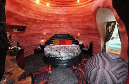 The bathroom is a blissful calm contrast from the firey red walls and lava floor in the main room. Open the circle window and breath the fresh rainforest air above the custom made hand polished limestone bathtub. Light a candle and take a bath or use the rainfall shower head. Admire the jungle flora just outside of the bathroom window, full of vibrant colors and life. Champagne is available on request.