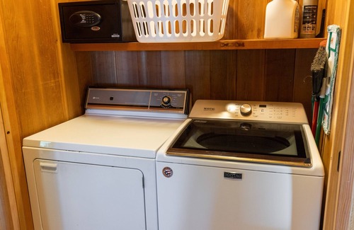 Restful, private sleeping spaces. Two thoughtfully appointed air‑conditioned bedrooms anchor either side of the home—one with a king bed, the other with a queen and two twins—each with their own en‑suite bathroom. A handy washer/dryer is tucked into the hallway off the primary suite for added convenience.