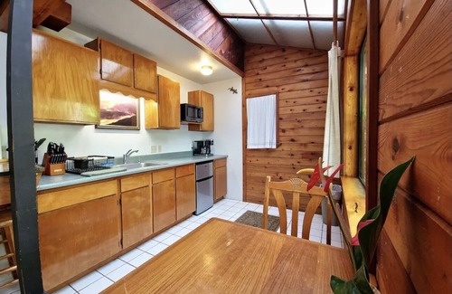 This private property has a house with two separated private apartments that consists of a 1 bedroom The Gecko Room and 1 studio The Volcano Room with fully-equipped kitchens. Walk down the beautiful pathway to your other two units that are behind the house. These two units The Nene Room and The Hapu’u Room have their own private entrance with kitchenettes and full bathrooms.