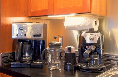 - Coffee and tea bar has a drip machine, espresso maker, french press, teapot, & sweeteners