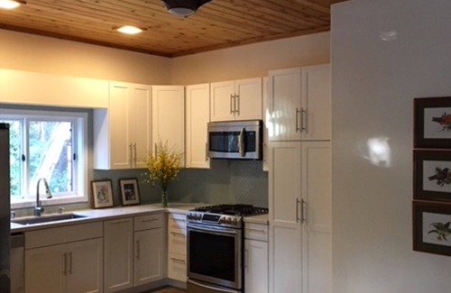 One large bathroom with Jacuzzi tub and shower. All wood floors and ceiling fans with gas fireplace and beautiful full chefs kitchen with all new Samsung appliances and washer/dryer. Large lotus pond and 2 private covered patios (lanai) with seating. Long desk looking over pond to comfortably be on laptop. Closest home is 400 ft away through the forest, so no next door barking dogs or roosters. Extremely quiet and peaceful, unique and a fully Hawaiian experience. Perfect for those who want to explore and hike in an upper elevation tropical rain forest. Not really the place for loud late night drinking parties.